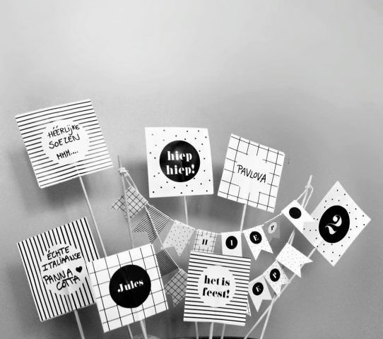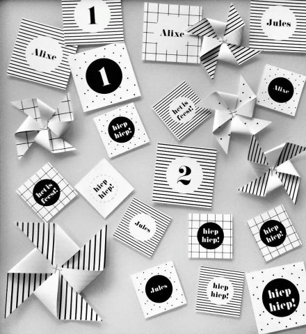 De uitnodiging ontwierp ik zelf. Ik koos bewust voor een genderneutraal thema en zwichtte voor de zwart/wit trend dat ik doortrok naar de aankleding van het feest.